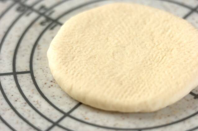 <成形する>閉じ目を上にして全体を手のひらで押さえ、麺棒で直径10cmくらいに伸ばす。