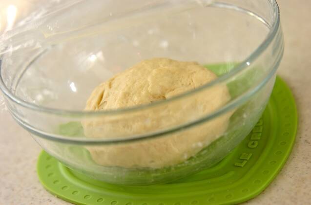 ひとまとまりになったら、無塩バター15gを加え、生地を台の上に出し、こねる。バターが馴染んだら、丸めなおして温かいところで30分発酵し、その後冷蔵庫で40分休ませる。