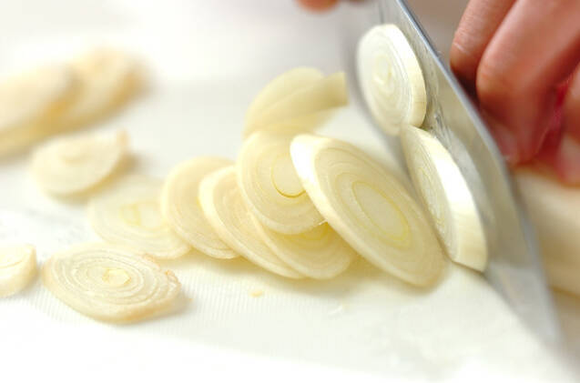 白ネギは斜め薄切りにする。