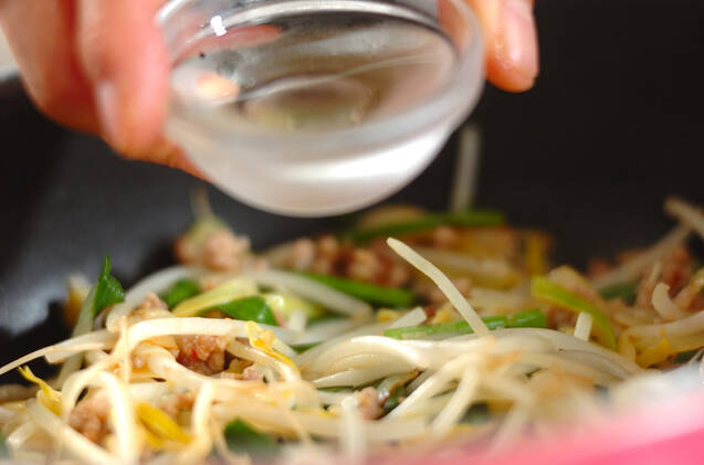モヤシ、ニラ、白ネギを加えて炒め、しんなりしたら<調味料>を加える。汁気が少なくなるまで炒め、器に盛る。
