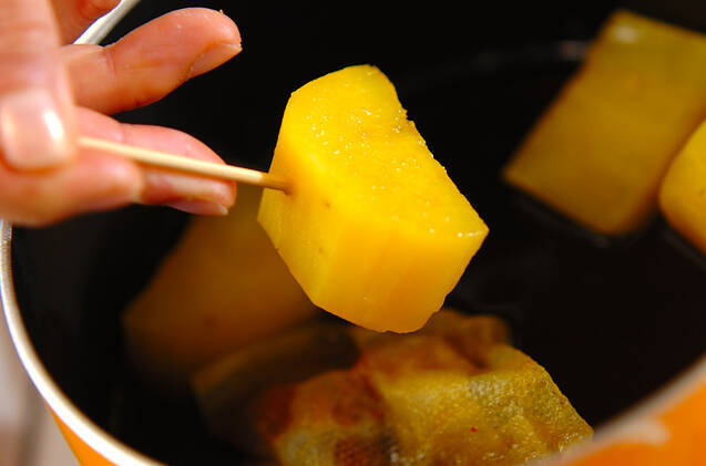 鍋に水きりしたサツマイモ、砂糖大さじ2、ハチミツ、塩少々、くちなしの実、たっぷりの水を入れて火にかける。煮たったら弱火で約12分煮る。竹串がスッと刺さればOKです。