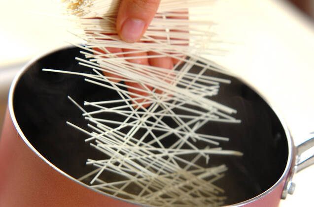 鍋にだし汁を入れて強火にかけ、煮たったら素麺を加える。