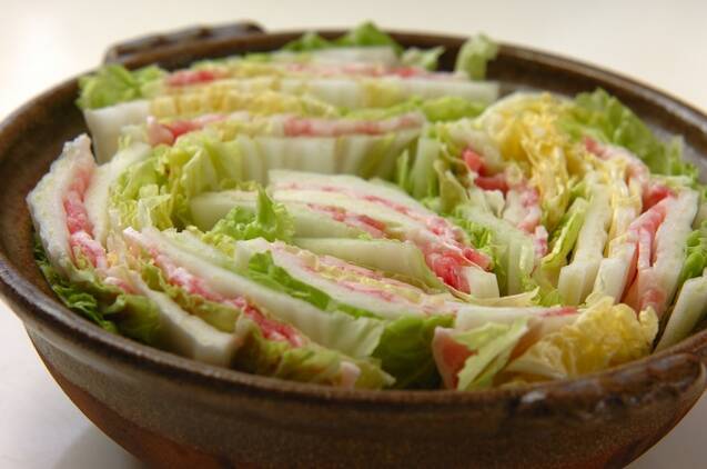 白菜と豚バラ肉を交互に2~3層重ね、幅5cmに切る。断面が見えるように、鍋に敷き詰める。<だし汁>の材料を鍋に入れる。
