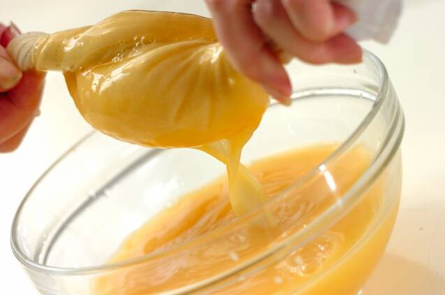 卵を溶きほぐし、<卵液>の材料と混ぜ合わせる。かたく絞ったぬれ布巾でこしてなめらかにし、器に分ける。