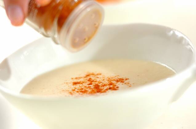 (5)を器に注ぎ、粉パプリカを振ってできあがり。