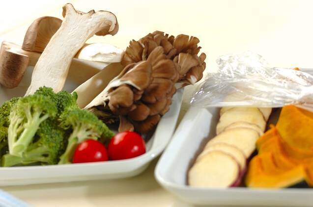 <焼き野菜>の準備をする。エリンギは縦半分に切る。マイタケ、ブロッコリーは、小房に分ける。サツマイモ、カボチャは、薄くスライスして耐熱容器に入れてラップをし、電子レンジで2分加熱する。