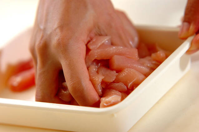 鶏むね肉は幅1cmの棒状に切り、<下味>の酒と塩を入れもみ込む。