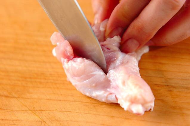 鶏手羽元は骨の際に切り込みを入れ、酒、しょうゆをからめる。片栗粉をつけて揚げ油でキツネ色に揚げる。