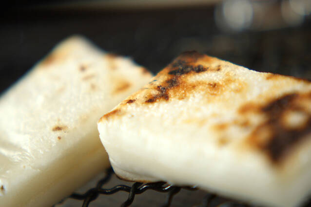 オーブントースター、または焼き網で角餅を色よく焼き、半分に切る。
