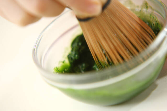 分量外の熱湯で温めた器に抹茶を入れ、熱湯大さじ4をかけて茶せんでダマができないように混ぜる。(ヒント)茶せんがない場合は泡立て器で混ぜ、ダマがある場合は茶こしなどでこしてください。