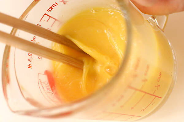 卵2個、牛乳大1、塩コショウを混ぜ合わせる。(菜ばしで50回くらいよく混ぜ合わせる)フライパンにサラダ油小1、バター5gを入れて中火にかけ、溶けたらバターを全体に薄く広げる。