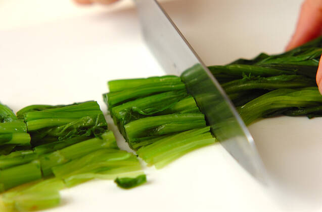 ホウレン草、春菊、ミツバはきれいに水洗いして根元を輪ゴムで止める。沸騰している熱湯に入れ、再び煮たったら水に放ち、粗熱が取れたら水気を絞って長さ3~4cmに切る。
