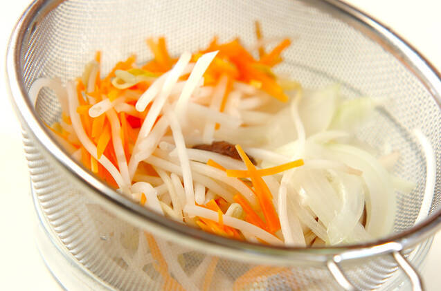 鍋にたっぷりのお湯を沸かし、モヤシ、玉ネギ、ニンジン、シイタケを入れ、サッとゆでてザルに上げる。