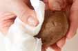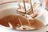 生シイタケは石づきを切り落とし、堅く絞った布巾で汚れを拭き取り、細切りにする。