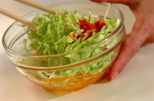ボウルにキャベツ、マヨネーズ、コチュジャンを入れ、混ぜ合わせる。