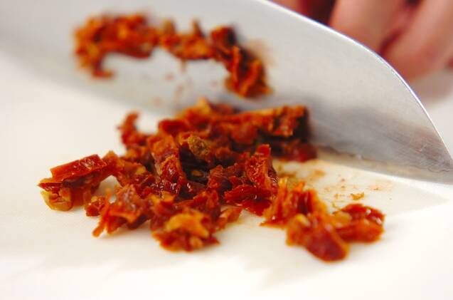ドライトマトは分量の水に入れてもどし、みじん切りにする。ドライトマトの戻し汁にインスタントドライイーストを入れて混ぜ溶かす。