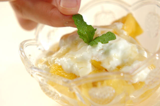器にパイナップルを入れてプレーンヨーグルトをかけ、さらにハチミツをかけてミントの葉を飾る。