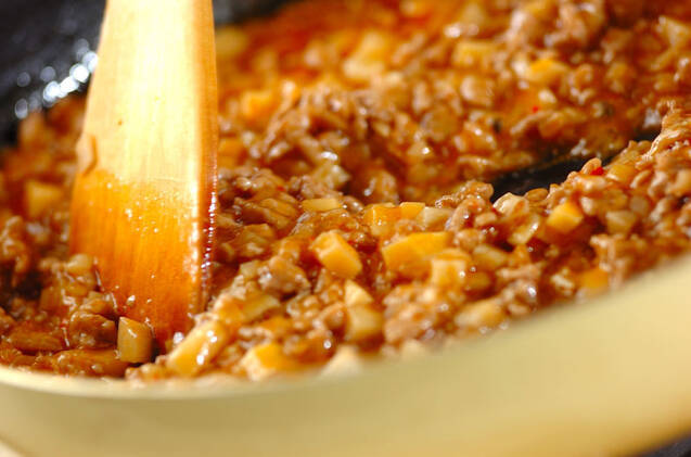 豚ひき肉の色が変わり、ポロポロになったら<調味料>の材料を加え、煮たったら4~5分位煮て、<水溶き片栗>をまわし入れる。トロミがついたら、ゴマ油を加えてひと混ぜする。(1)の木綿豆腐にかけ、刻みネギをのせる。