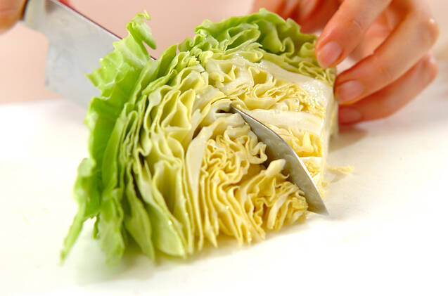 春キャベツは4つのくし切りにし、ザッと水洗いして芯を切り落とし、横半分に切ってバラバラにしておく。