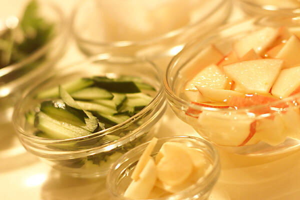 大根は皮をむき、3mm幅のイチョウ切りにし塩をからめておく。キュウリは水洗いして斜め薄切りにし、更に細切りにする。リンゴは皮ごときれいに水洗いし、芯を切り落として3mm厚のイチョウ切りにし、塩水に放つ。ミョウガは水洗いして縦半分に切り、更に薄切りにして水に放つ。ミツバは根元を切り落とし、3cmの長さに切る。