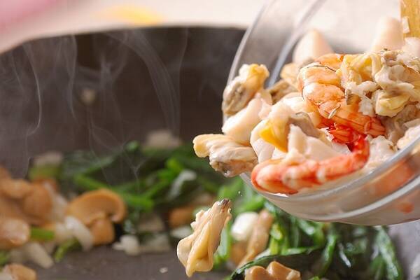 フライパンにオリーブ油を熱し、玉ネギ、マッシュルームを加えて炒める。玉ネギが透き通ってきたら塩コショウで味を調え、ほうれん草、エビ、ホタテ貝柱、アサリ、煮詰めた煮汁、残りのホワイトソースを加えて全体に混ぜ合わせ、フツフツしてきたら火を止める。