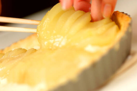 5のタルト型に<アーモンドクリーム>を平らに入れ、汁気を切って薄切りにした洋梨のコンポートを並べる。