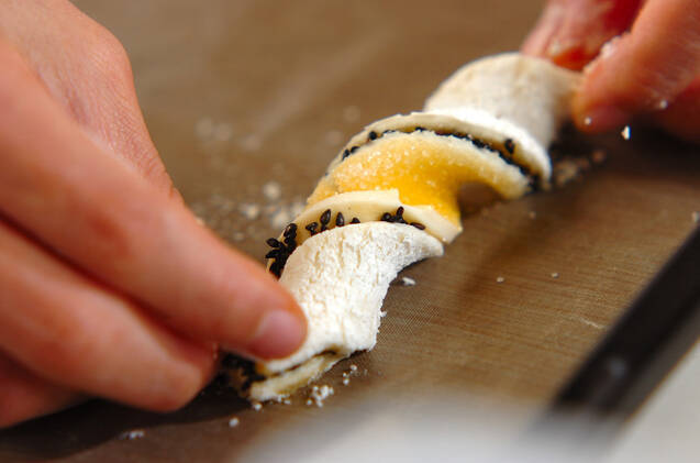 (2)のパイシートを8等分の棒状に切ってねじり、オーブンシートを敷いた天板に並べ、230℃に予熱しておいたオーブンで9~10分焼く。