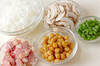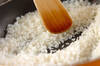 フライパンにバター10gを入れて中火にかけ、バターが溶けたら洗ったお米を炒め、お米が透き通ってきたら炊飯器に入れる。<調味料>を加え、通常に炊く時の位置まで水を注いでひと混ぜする。
