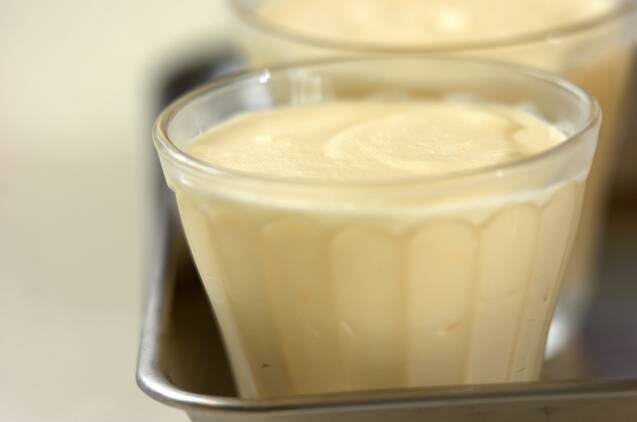 (3)に(4)の<メレンゲ>を加えてゴムベラでふんわりと均一に混ぜたら器に分け入れ、冷蔵庫で冷やしかためる。