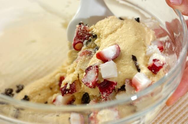 (3)にゆでタコ足、ブラックオリーブ、パルメザンチーズを加えて混ぜ合わせる。