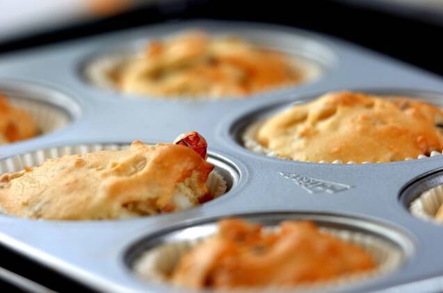 マフィン型に生地を入れて180℃に予熱しておいたオーブンで20~25分ほど焼く。