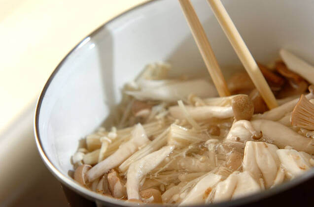 たっぷりの熱湯に塩を加え、キノコ類をサッとゆでて水気をきる。