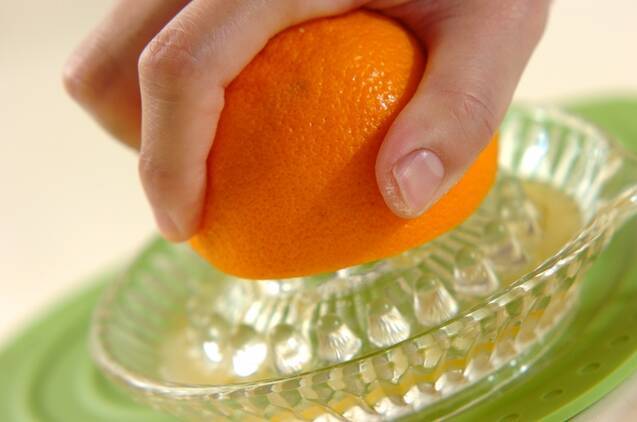<オレンジソース>オレンジを半分に切り、果汁を絞る。砂糖、レモン汁、グランマニエを加え、ハンドブレンダーにかける。