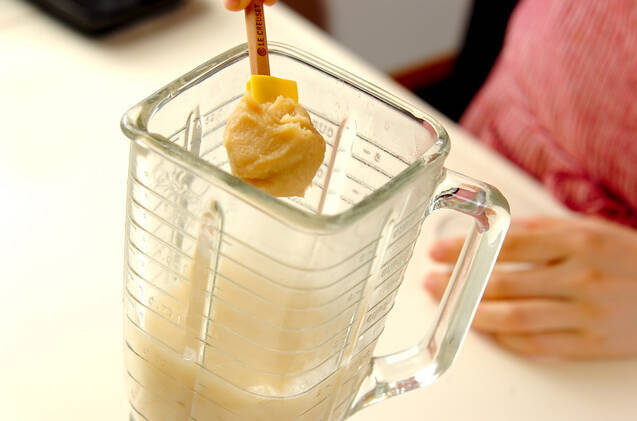 ミキサーに(2)、豆乳、白みそを加え、かくはんして網に通す。器に注ぎ、刻み細ネギを散らす。