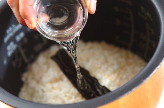 お米は洗ってザルに上げる。炊飯器に洗い米を入れ、ぬれ布巾で汚れを拭き取った昆布をのせる。酒を加えて通常の水加減で炊く。