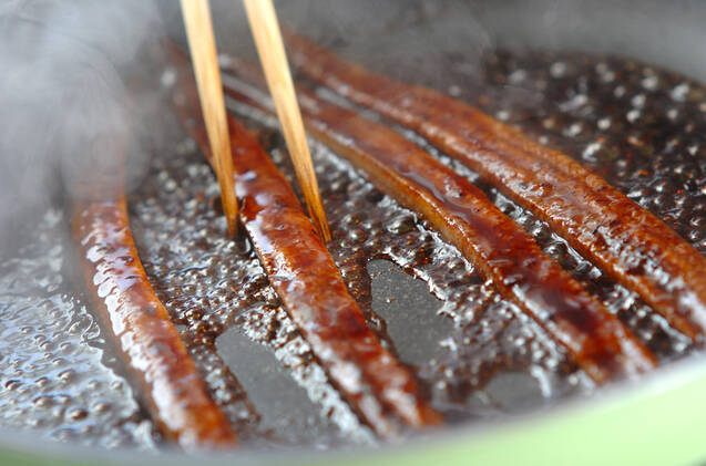 ウナギ蒲焼きは縦4等分に切り、フライパンにウナギ蒲焼きのタレと共に入れ、からめながら焼く。