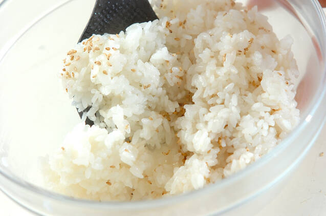 ご飯が炊き上がったら昆布を取り出し、ボウルにあける。熱いうちに寿司酢を全体にまわしかけ、1分そのままおいて蒸らし、切るように手早く混ぜる。半量には白ゴマを加え、混ぜ合わせてかたく絞ったぬれ布巾をかけて冷ます。