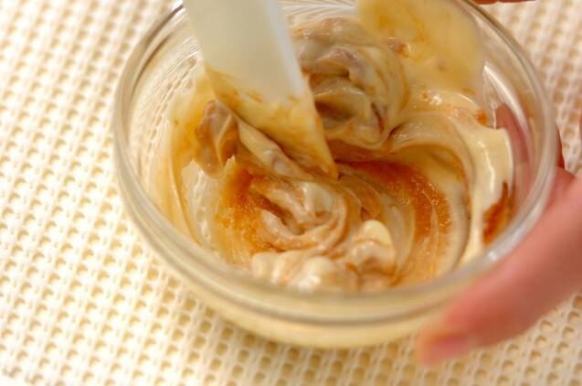<みそマヨディップ>のみそとマヨネーズを合わせ、ダマにならないようによく混ぜる。キュウリとパプリカに添える。