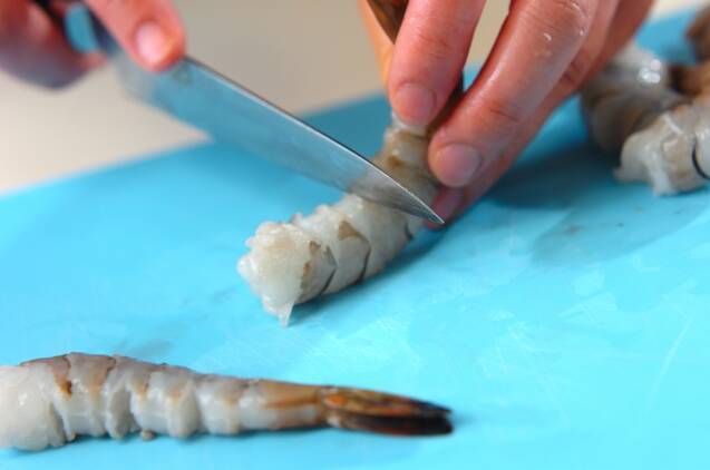 エビは第1関節から殻をむき、背ワタを取る。腹側に3~4カ所切り込みを入れ、背側から押さえてまっすぐにのばし、塩コショウをする。