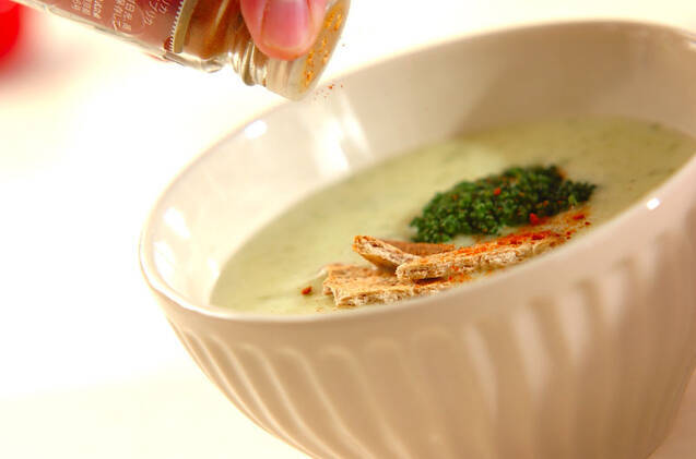再び煮たつ直前に生クリームを加え、塩で味を調えてバターを加え、ひと混ぜする。器に注ぎ、砕いたクラッカー、飾り用のブロッコリーを入れ、粉パプリカを振る。