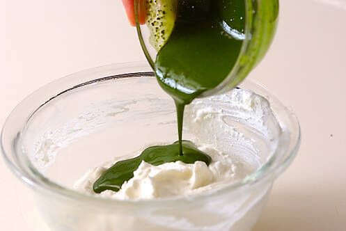 ボウルにカッテージチーズを入れ、泡立てた生クリームを少しずつ加え、ゴムベラで混ぜ合わせる。熱湯で溶いた抹茶も加えて混ぜ合わせる。