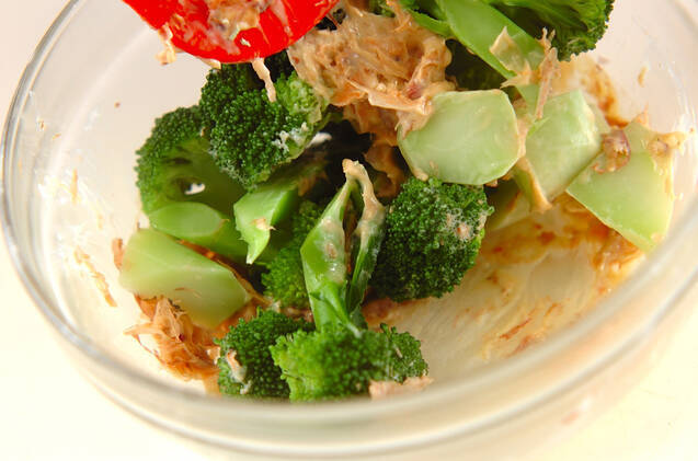 熱湯にブロッコリーを加え、サッとゆでてザルに上げ、<おかかマヨ>のボウルに加えて和え、器に盛る。