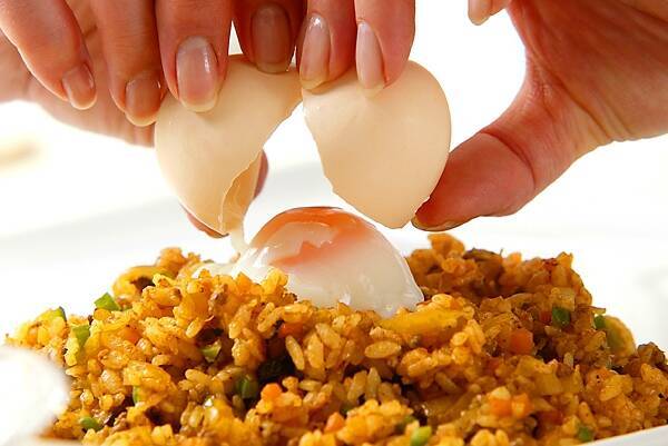 3を戻し入れ、レーズンを加える。全体に混ぜ合わせるように炒め合わせ、塩コショウで味を調える。器に盛り分け中央に少しくぼみを作り、温泉卵を割り入れる。