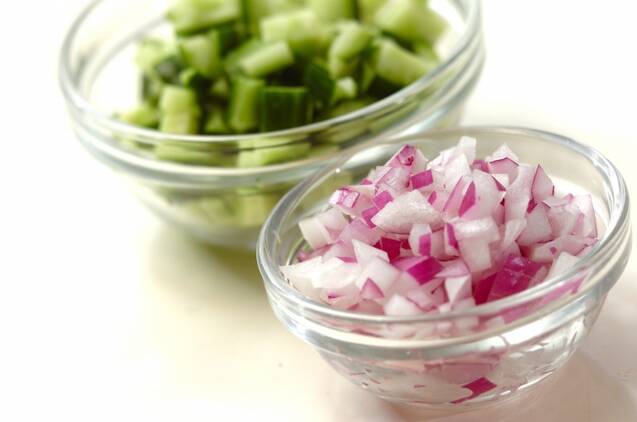 枝豆は解凍し、サヤから出す。キュウリと紫玉ネギは粗みじん切りにする。