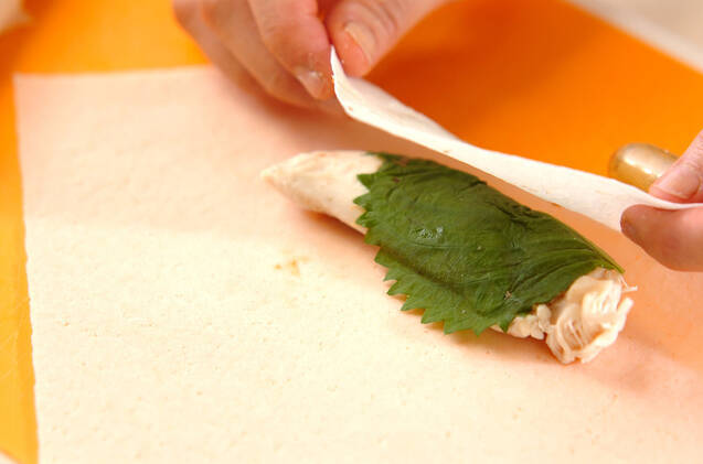 春巻きの皮に、鶏ささ身、梅肉、大葉をのせて、まわりに<のり>をぬりながら巻く。180℃の揚げ油でこんがりと揚げる。