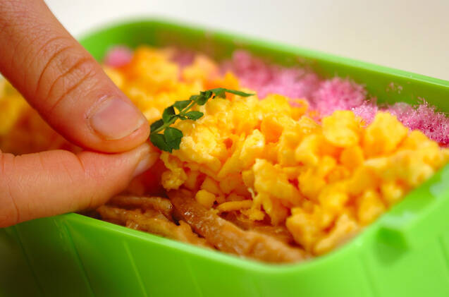 <すし飯>の上に、油揚げ、(2)、桜でんぶを1列ずつ並べ、木の芽を飾る。