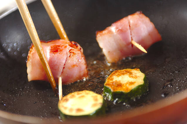 フライパンにオリーブ油を熱し、(1)を入れて焼く。ズッキーニに塩コショウを振り、プチトマトのベーコン巻きと共につま楊枝に刺す。