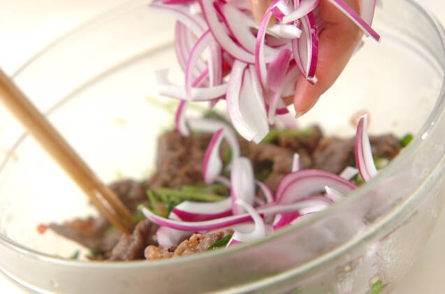 <調味料>が全体にからまれば、紫玉ネギ、香菜を加え更に混ぜ合わせる。