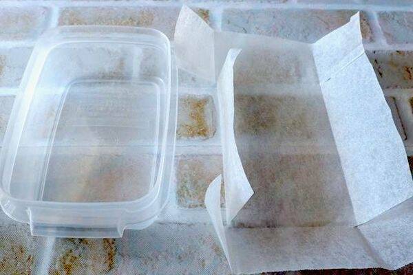 ・クッキングシートを平たいプラスチック容器やバットに敷いておく。