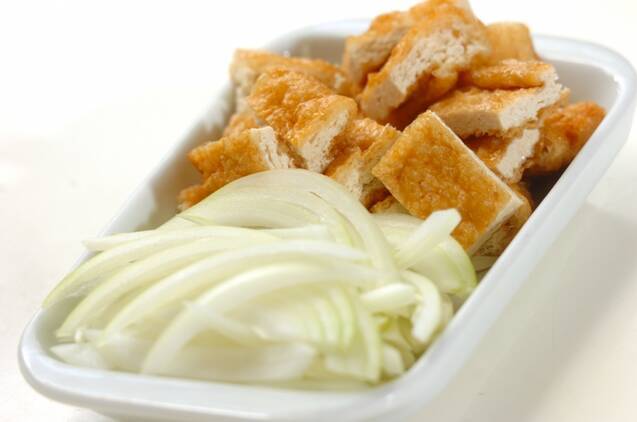 玉ネギは薄切りにする。油揚げは熱湯をかけ、ひとくち大に切る。